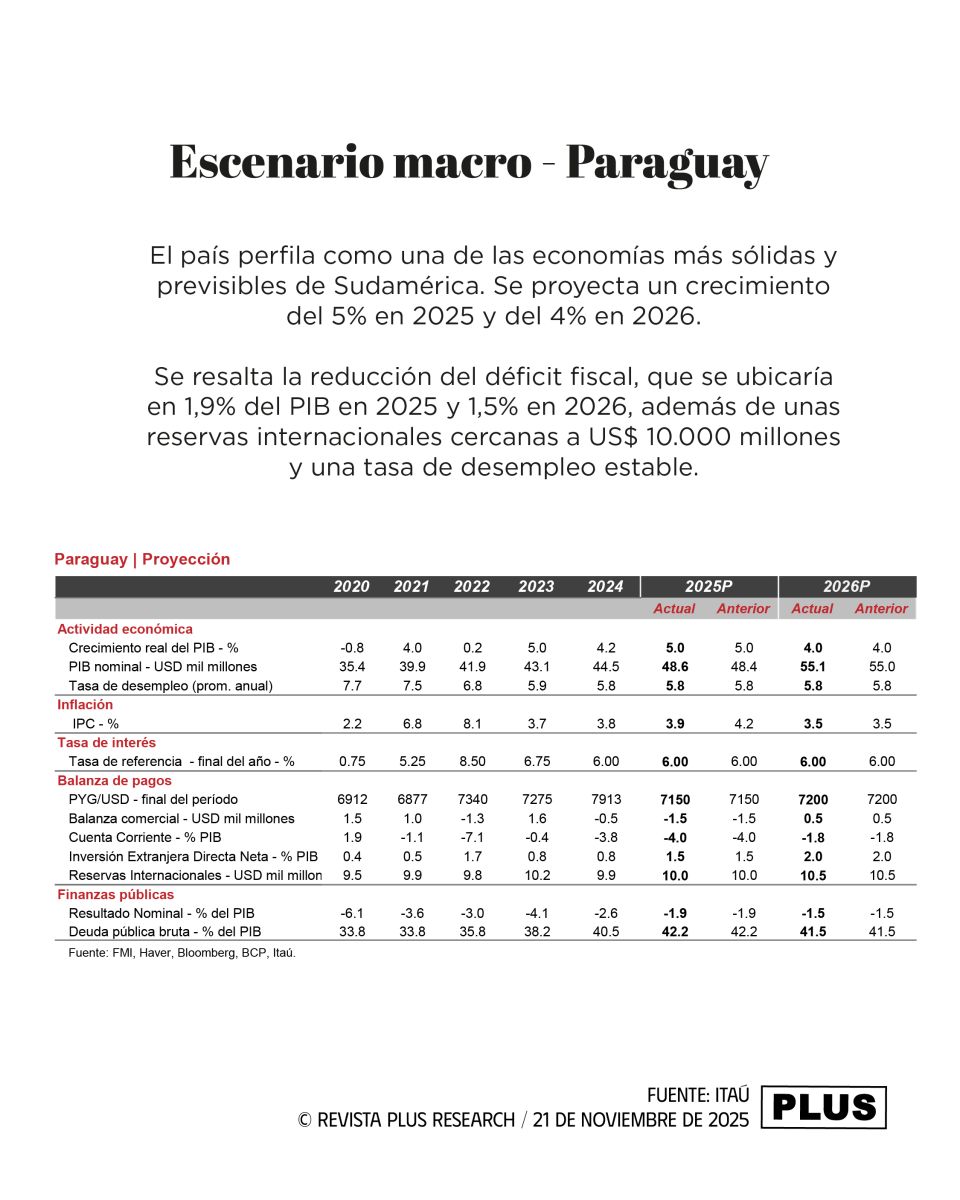 El informe de Itaú concluye que la combinación de crecimiento sostenido, baja inflación y prudencia fiscal deja a Paraguay en una posición de fortaleza para 2026, con riesgos al alza para el crecimiento y un clima propicio para nuevas inversiones en infraestructura, energía y agroindustria.