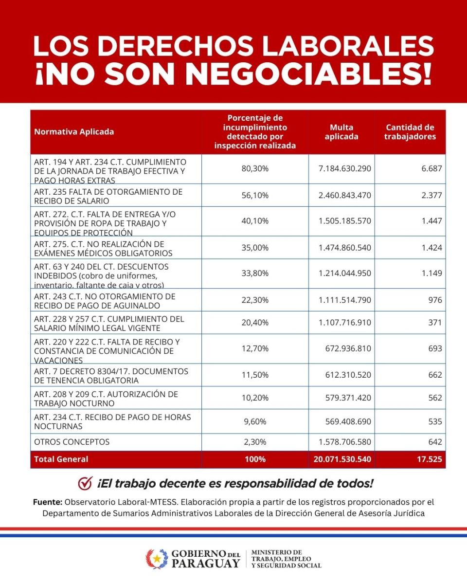 Las inspecciones revelaron incumplimientos generalizados en jornada laboral, pago de horas extras, documentación salarial y medidas de seguridad. Más de G. 20.000 millones en multas fueron aplicados durante este periodo de Gobierno.