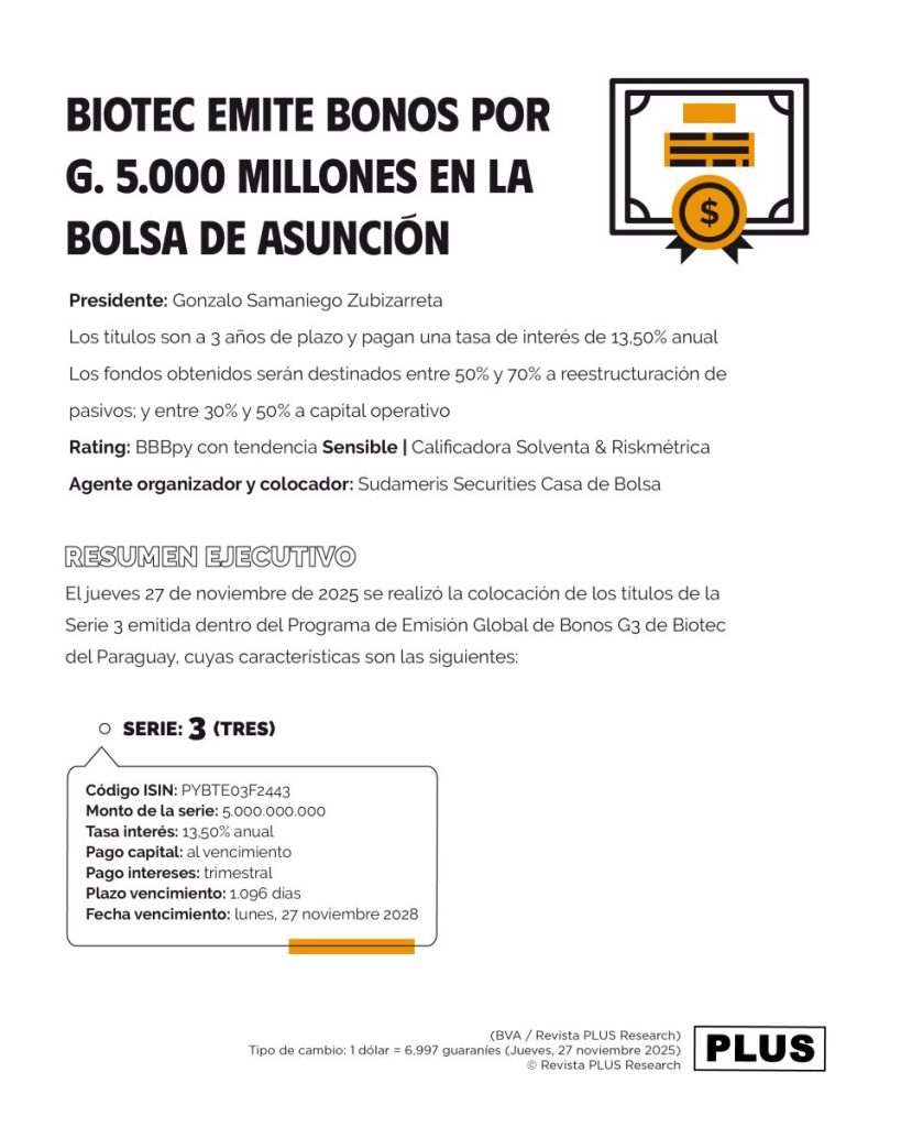 El jueves 27 de noviembre de 2025 se realizó la colocación de los títulos de la Serie 3 emitida dentro del Programa de Emisión Global de Bonos G3 de Biotec del Paraguay, cuyas características son las siguientes: