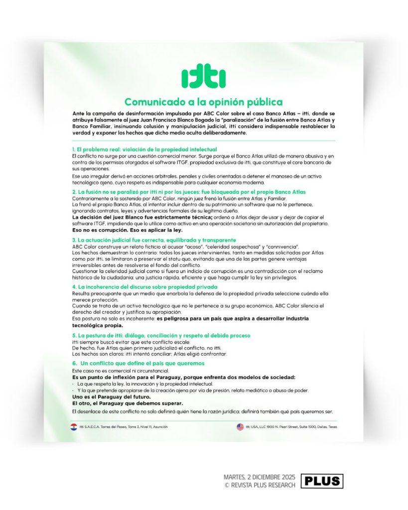 En un escenario marcado por señalamientos cruzados y una fuerte batalla mediática, la empresa itti difundió un comunicado dirigido a la opinión pública para contrarrestar, según afirma, una campaña de desinformación impulsada por el diario ABC Color en torno al conflicto que mantiene con Banco Atlas por el uso del software ITGF, considerado el núcleo tecnológico de sus operaciones.