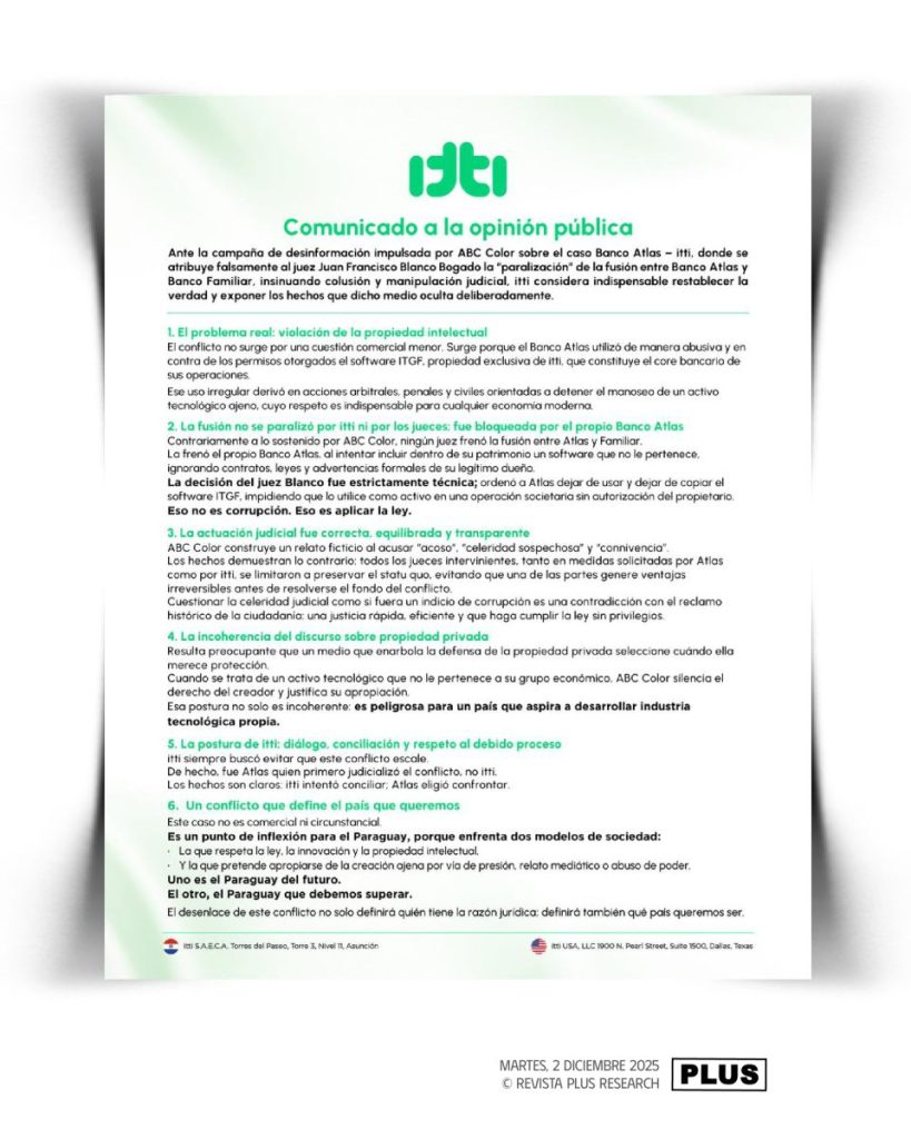 En un escenario marcado por señalamientos cruzados y una fuerte batalla mediática, la empresa itti difundió un comunicado dirigido a la opinión pública para contrarrestar, según afirma, una campaña de desinformación impulsada por el diario ABC Color en torno al conflicto que mantiene con Banco Atlas por el uso del software ITGF, considerado el núcleo tecnológico de sus operaciones.