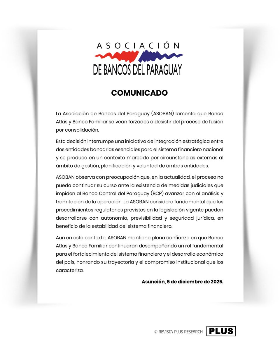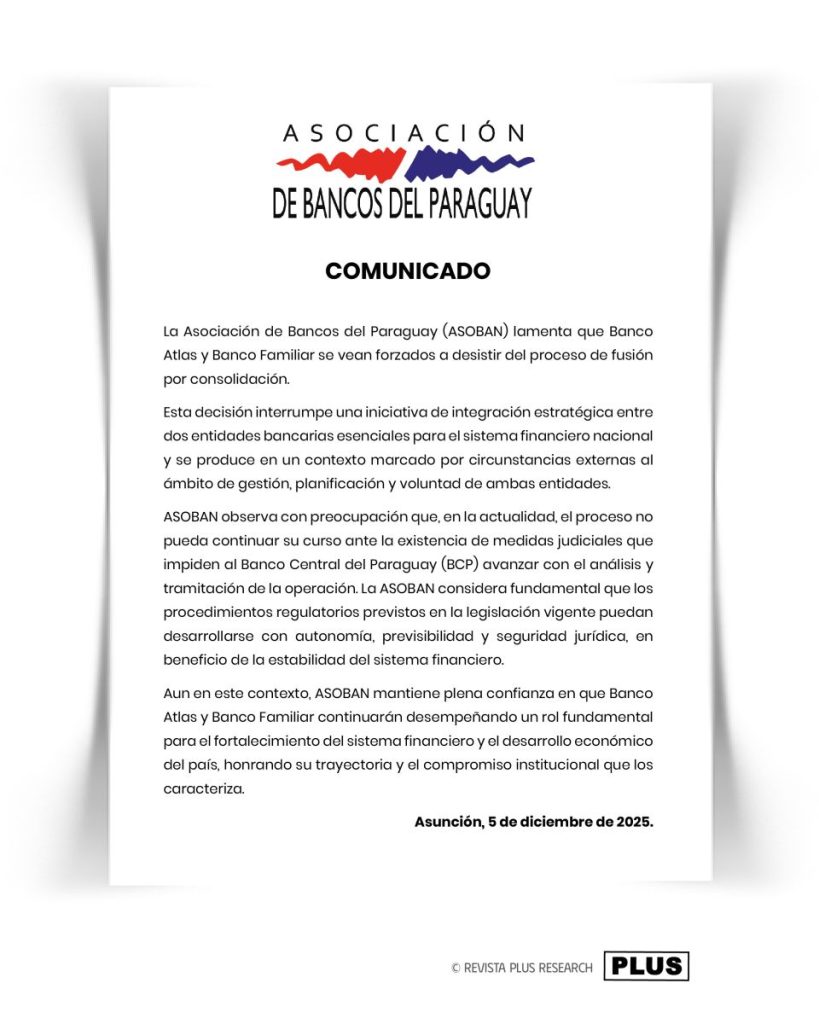 La Asociación de Bancos del Paraguay (Asoban) emitió un comunicado en el que no oculta su pesar por la decisión: lamenta que ambas instituciones “se vean forzadas a desistir del proceso de fusión”, una iniciativa que, según señala, tenía el potencial de fortalecer aún más la estructura financiera del país.