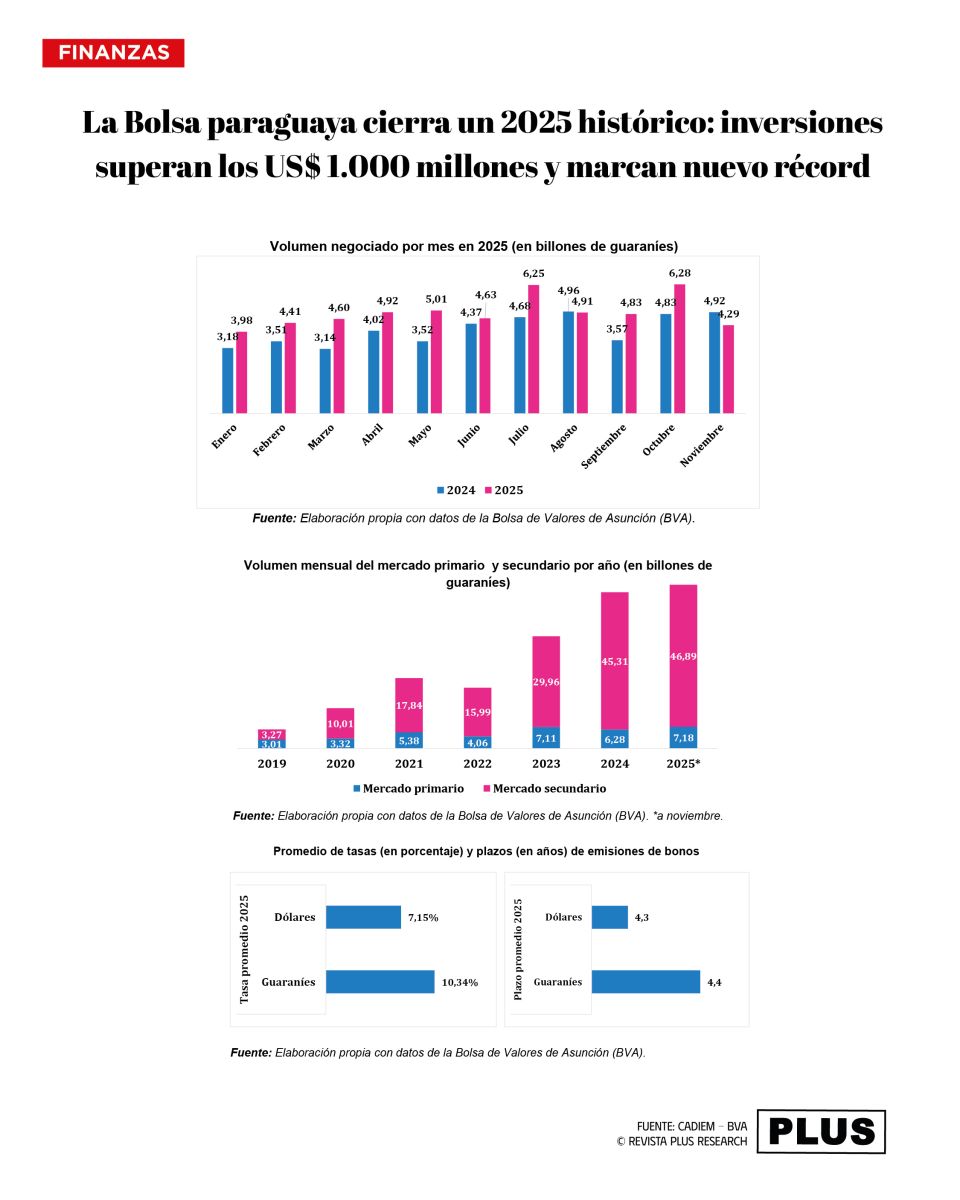 La Bolsa de Valores de Asunción (BVA) se encamina a cerrar un año sin precedentes. Entre enero y noviembre, el volumen negociado alcanzó G. 54,1 billones (US$ 7.749 millones), un salto del 21% frente al mismo periodo del 2024 y por encima del total anual de ese año. Incluso con un noviembre más moderado, G. 4,2 billones, el mercado ya aseguró una nueva plusmarca histórica.