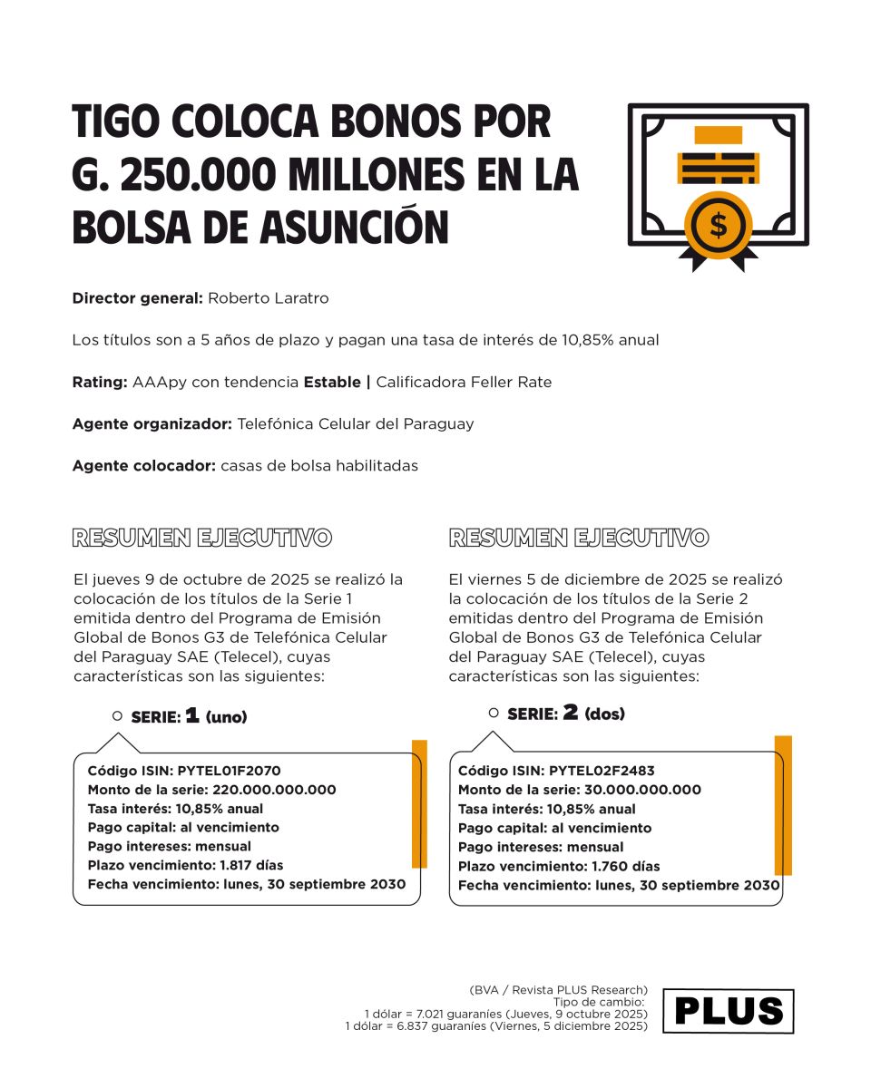 El viernes 5 de diciembre de 2025 se realizó la colocación de los títulos de la Serie 2 emitidas dentro del Programa de Emisión Global de Bonos G3 de Telefónica Celular del Paraguay SAE (Telecel), cuyas características son las siguientes: