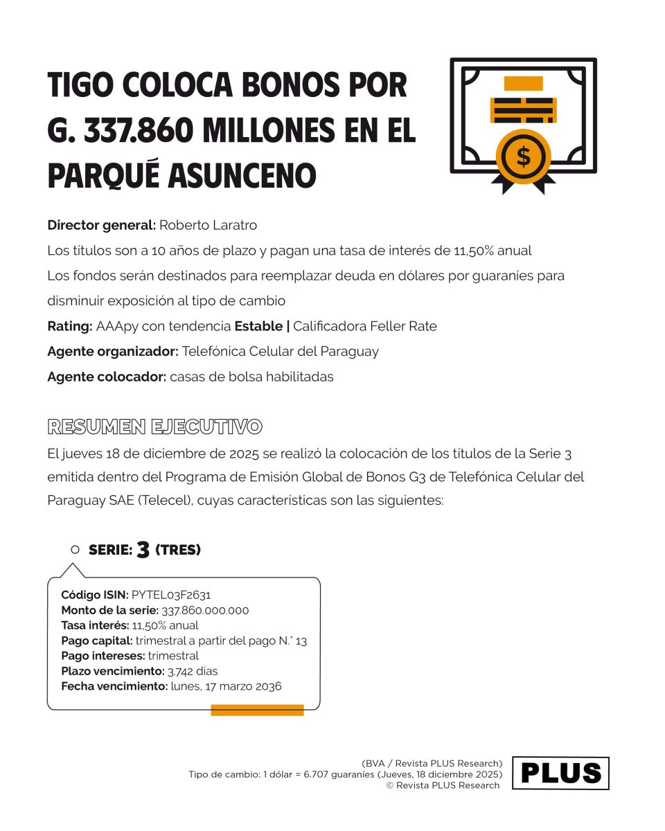 El jueves 18 de diciembre de 2025 se realizó la colocación de los títulos de la Serie 3 emitida dentro del Programa de Emisión Global de Bonos G3 de Telefónica Celular del Paraguay SAE (Telecel), cuyas características son las siguientes: