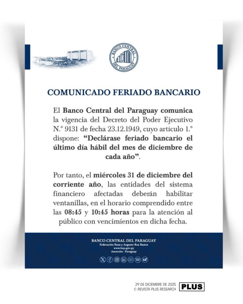 El Banco Central del Paraguay (BCP) informó que el miércoles 31 de diciembre será feriado bancario, conforme a lo establecido en el Decreto N.° 9.131. La medida alcanza a las entidades financieras del país en el último día hábil del año, una fecha clave para el movimiento de fondos, cierres contables y planificación financiera.
