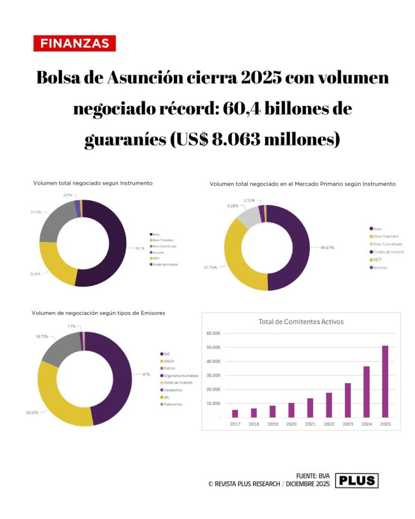 Asunción (Paraguay).- La Bolsa de Valores de Asunción (BVA) cerró el 2025 con un volumen récord de G. 60,4 billones, equivalente a US$ 8.063 millones, superando ampliamente los resultados de 2024 y marcando un hito para el mercado de capitales paraguayo.
