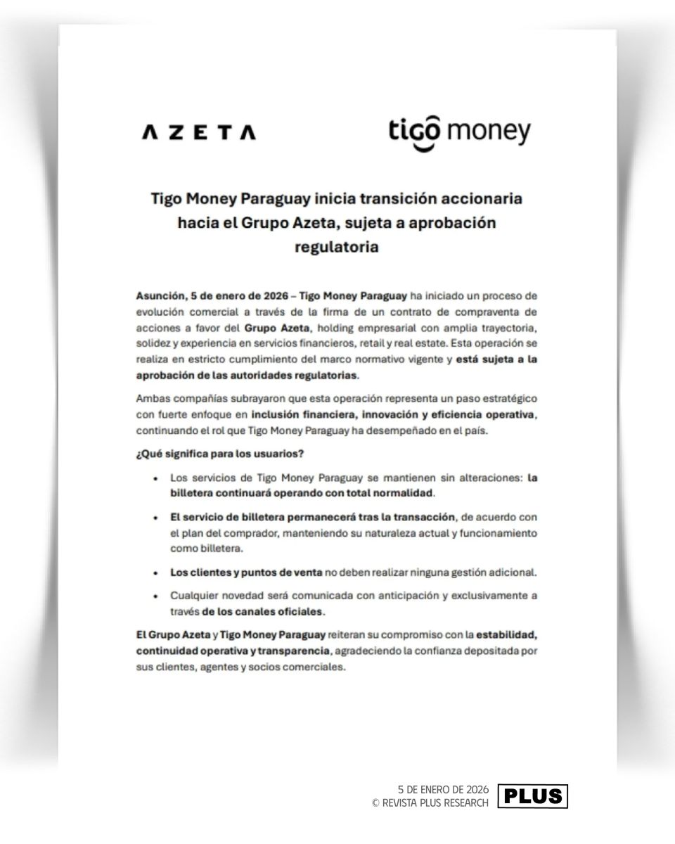 Tigo Money Paraguay inició un proceso de transición accionaria hacia el Grupo Azeta, tras la firma de un contrato de compraventa de acciones que marca un nuevo capítulo para el ecosistema de pagos digitales en el país. La operación, aún sujeta a la aprobación de las autoridades regulatorias, se enmarca dentro de una estrategia de inversión y expansión liderada por uno de los holdings empresariales con mayor trayectoria en la región.