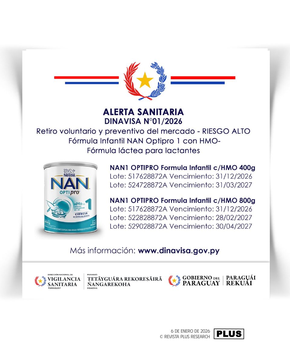 La Dirección Nacional de Vigilancia Sanitaria (Dinavisa) encendió las alertas en el sector de alimentos infantiles tras comunicar que Nestlé Paraguay SA inició un retiro voluntario del mercado de determinados lotes de su fórmula NAN Optipro 1 con HMO.