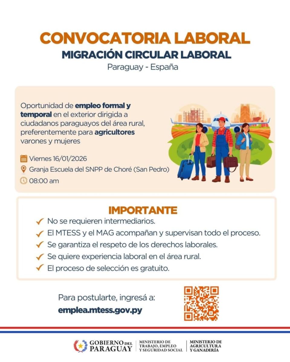 Los ministerios de Agricultura y de Trabajo avanzan en un programa que permitirá a jóvenes agricultores acceder a empleos formales temporales en el exterior, con capacitación y retorno garantizado al país. La primera convocatoria se realiza este 16 de enero desde las 08:00 en la Granja Escuela del SNPP de la ciudad de Choré en el departamento de San Pedro.