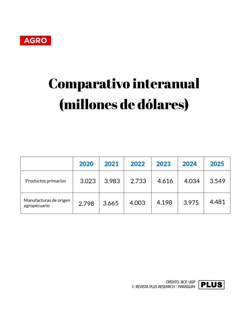 En una mirada de mediano plazo, entre 2020 y 2025 las exportaciones paraguayas exhibieron una alternancia en el liderazgo entre productos primarios y MOA.