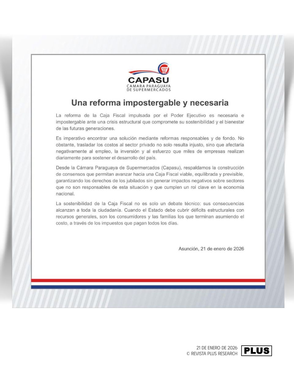 La Cámara Paraguaya de Supermercados (Capasu) se sumó al debate sobre la reforma de la Caja Fiscal impulsada por el Poder Ejecutivo, al considerar que los cambios son necesarios e impostergables frente a una crisis estructural, aunque advirtió que trasladar los costos al sector privado generaría efectos negativos sobre la economía y el empleo