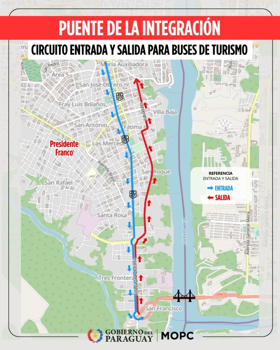 Asimismo, a partir del 29 de enero de 2026, el tráfico internacional de autobuses turísticos en circuito cerrado cuyo destino final no sea Foz do Iguazú, Ciudad del Este o Presidente Franco, se realizará exclusivamente por el Puente de la Integración, en el horario comprendido entre las 19:00 y las 07:00 horas, todos los días; y exclusivamente por el Puente de la Amistad en el horario comprendido entre las 07:00 y las 19:00 horas, todos los días.