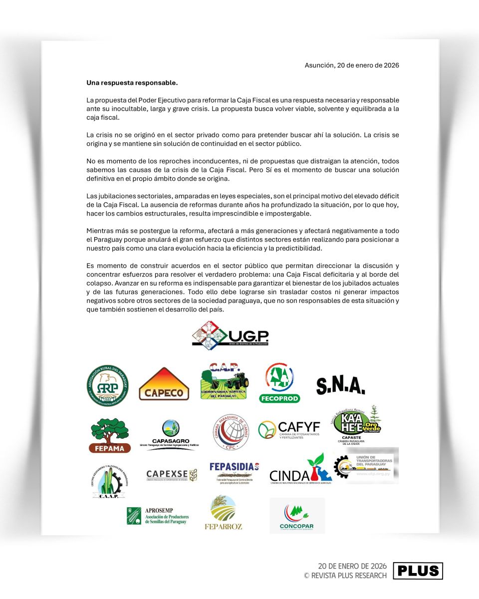 En un comunicado emitido este lunes en Asunción, la UGP sostuvo que la iniciativa oficial apunta a devolver viabilidad, solvencia y equilibrio a la Caja Fiscal, actualmente afectada por un déficit estructural que, según el gremio, no se originó en el sector privado.