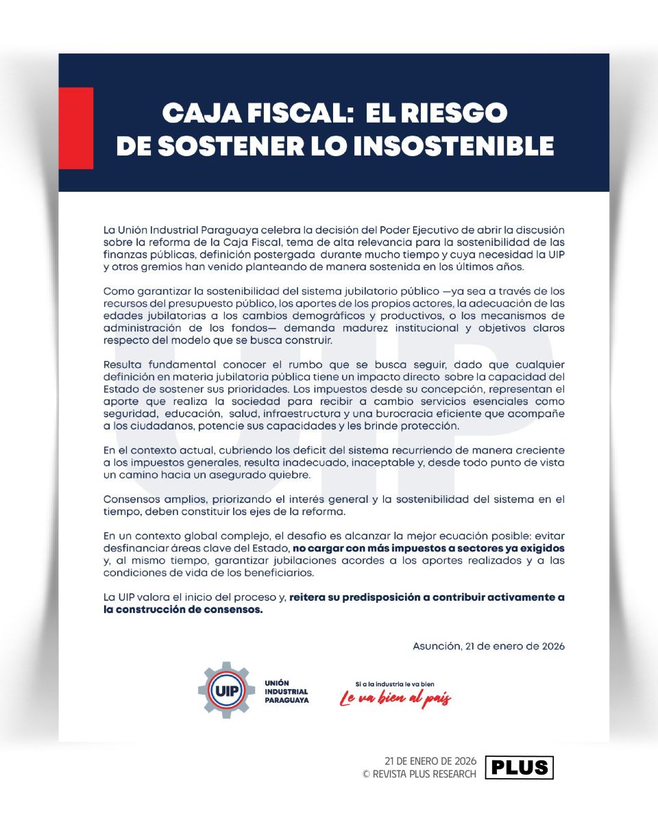 En un comunicado difundido este 21 de enero, la UIP señaló que la reforma de la Caja Fiscal es una definición largamente postergada y de alta relevancia para la sostenibilidad de las finanzas públicas, una preocupación que el gremio, junto con otros sectores, viene planteando desde hace años.
