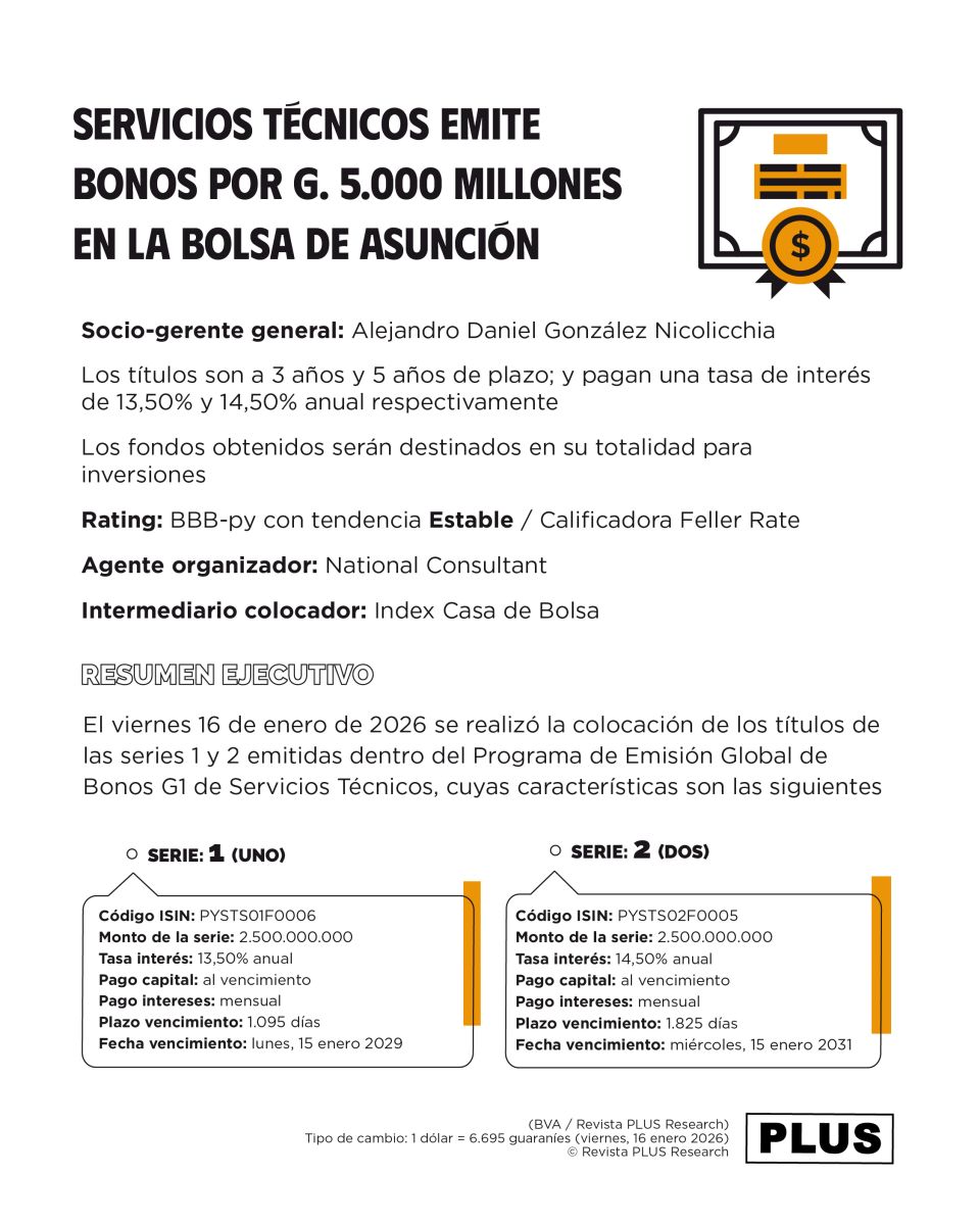 El viernes 16 de enero de 2026 se realizó la colocación de los títulos de las series 1 y 2 emitidas dentro del Programa de Emisión Global de Bonos G1 de Servicios Técnicos, cuyas características son las siguientes: