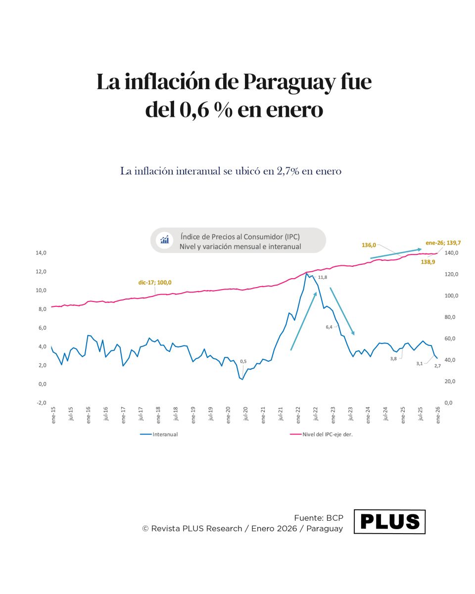 La inflación interanual (enero 2025-enero 2026) se situó en el 2,7 %, por debajo del 3,8 % registrado en el mismo periodo del año anterior, señaló el Banco Central de Paraguay (BCP) en un informe.