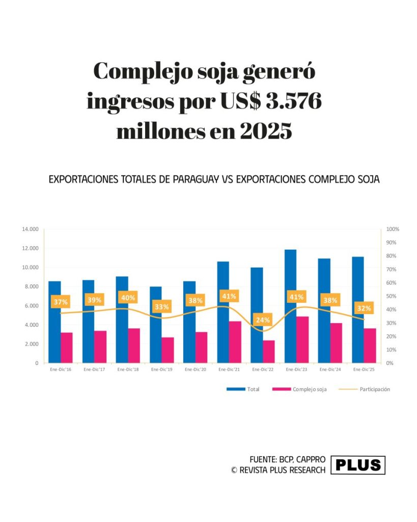 Asunción (Paraguay).- Las divisas generadas por el complejo soja (incluyendo granos, aceite, harina y cascarilla) durante el 2025 alcanzaron US$ 3.576,94 millones, una modificación del -14% con respecto a lo que se había conseguido el año precedente.