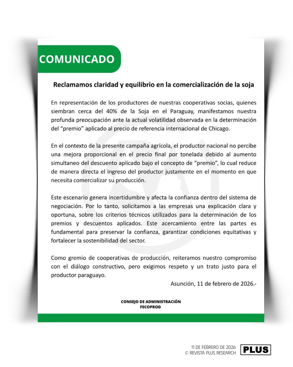 Como gremio de cooperativas de producción, la entidad reiteró su compromiso con el diálogo constructivo, pero exigió respeto y un trato justo para el productor paraguayo, en un contexto de alta volatilidad internacional y presión sobre los márgenes del sector agrícola.