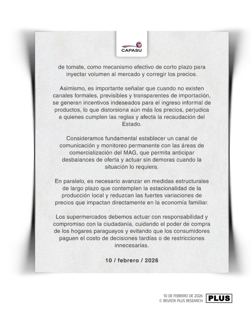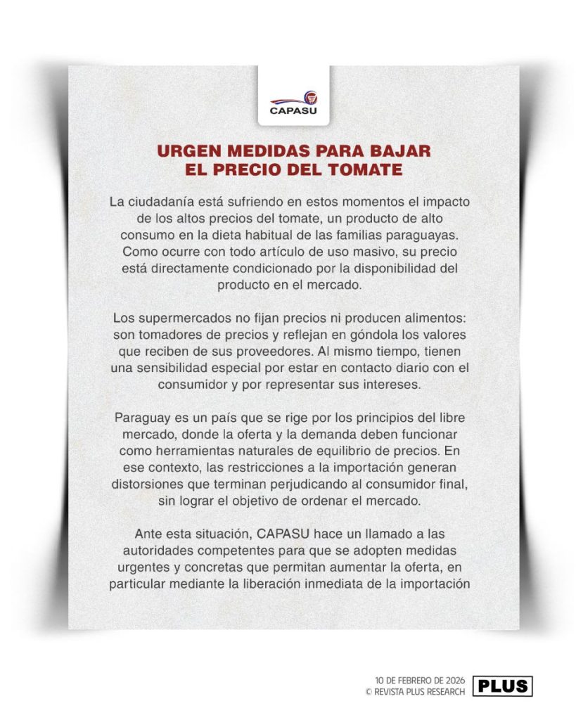 La Cámara Paraguaya de Supermercados (Capasu) emitió un pronunciamiento en el que manifiesta su preocupación por el impacto que los altos precios del tomate están generando en la economía familiar. El producto, considerado básico en la dieta de los paraguayos, atraviesa actualmente una etapa de fuerte encarecimiento vinculada —según el sector— a problemas de disponibilidad en el mercado.