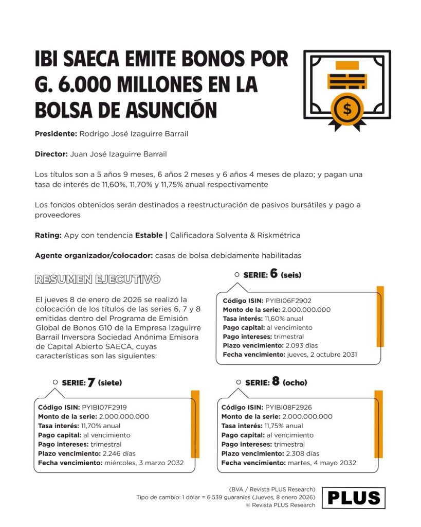 El jueves 8 de enero de 2026 se realizó la colocación de los títulos de las series 6, 7 y 8 emitidas dentro del Programa de Emisión Global de Bonos G10 de la Empresa Izaguirre Barrail Inversora Sociedad Anónima Emisora de Capital Abierto SAECA, cuyas características son las siguientes: