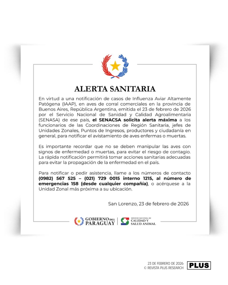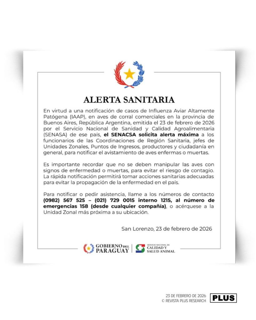 Asunción, 24 feb (EFE).- El Servicio Nacional de Calidad y Salud Animal (Senacsa) de Paraguay requirió a sus funcionarios y a productores locales permanecer en «máxima alerta» después de que se detectara un caso de Influenza Aviar Altamente Patógena (IAAP) en aves de corral en Argentina.