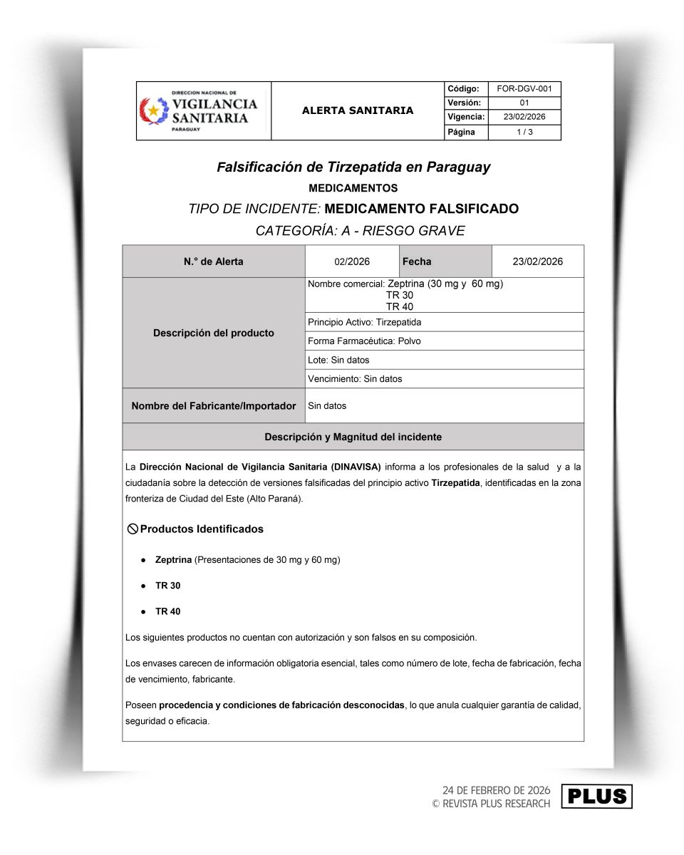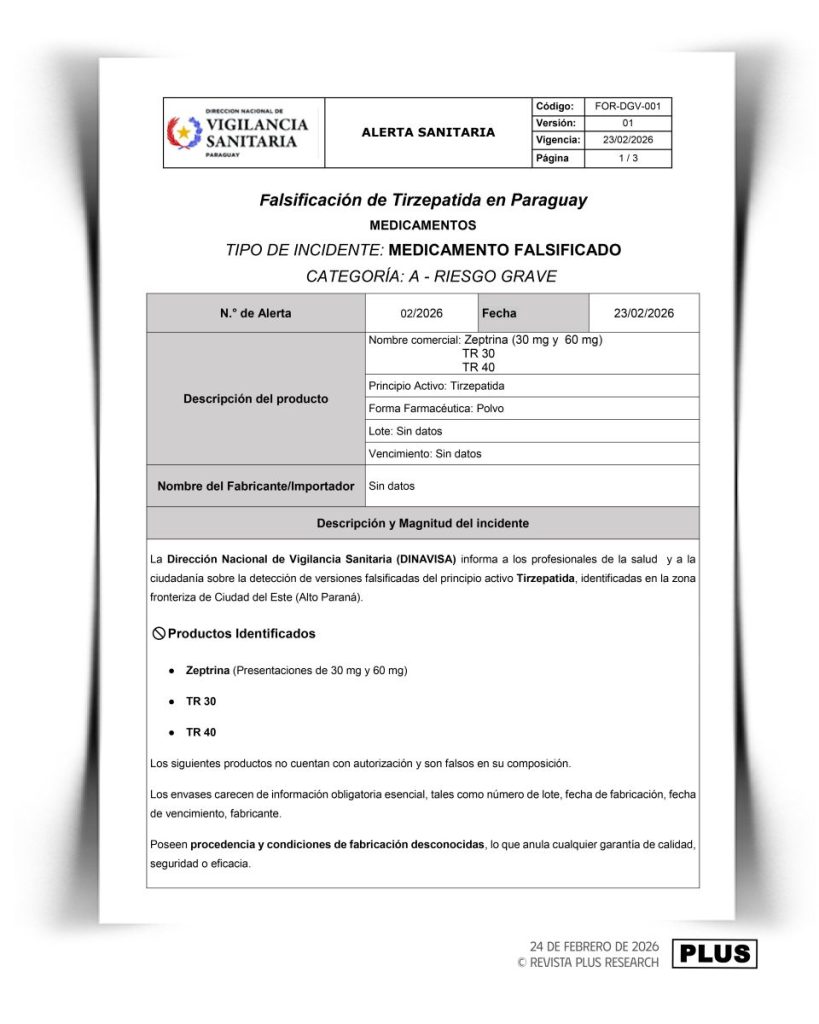 La Dirección Nacional de Vigilancia Sanitaria (Dinavisa) emitió la Alerta N.º 02/2026, tras detectar la circulación de Tirzepatida falsificada en la zona fronteriza de Ciudad del Este, Alto Paraná.