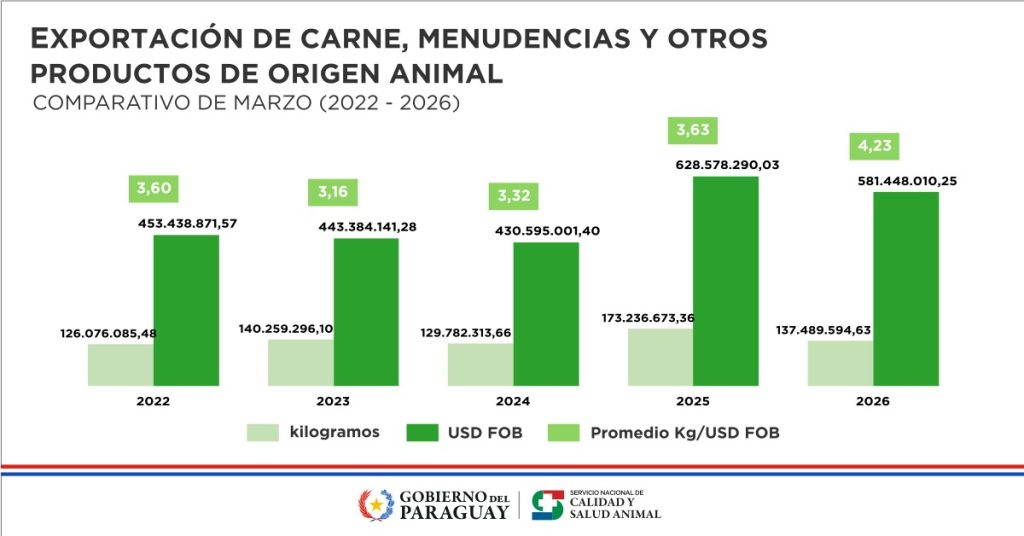 El comercio exterior de carne paraguaya muestra un cambio de tendencia en 2026: menor volumen exportado, pero con precios internacionales más favorables. La Unión de Gremios de la Producción (UGP) advierte una reconfiguración del mercado tras un año récord.