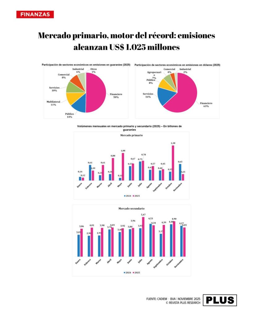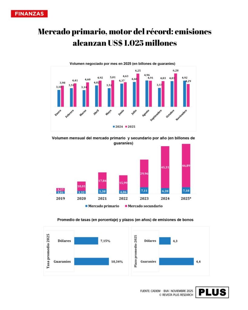 El gran protagonista hasta noviembre de 2025 fue el mercado primario. Las emisiones de títulos superaron los G. 7,18 billones (US$ 1.025 millones) y dejaron atrás el récord registrado en 2023. El crecimiento interanual de 60,5% refleja el mayor ímpetu inversor de las empresas, en línea con una economía que avanza por encima del 5%.